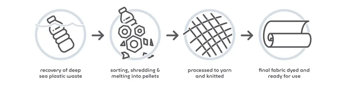 An estimated 75% of ocean waste can only be found in the depths – invisible from the surface. In a program that is successfully clearing ocean floors of waste of all kinds, plastics are extracted, processed, and spun into 100% recycled polyester filaments to produce sustainable fabrics of the highest quality.