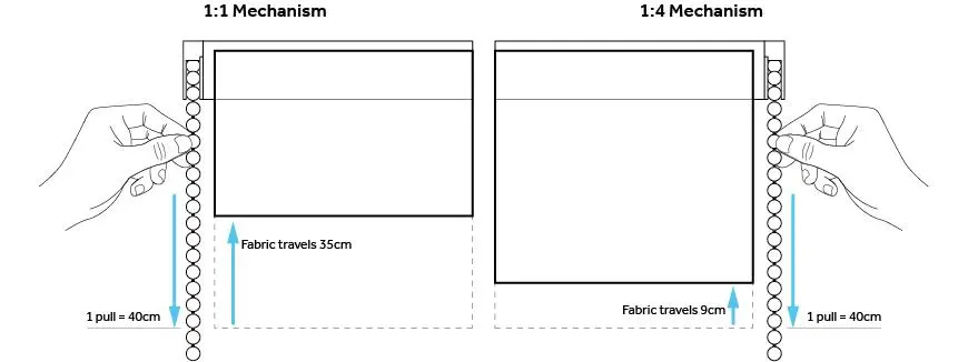 The roman mechanisms work on the ratio of transferring rotation from the chain cog to the cord drums that move the fabric. It’s the relation between the length of the chain pulled and the distance the fabric’s travelled. So, with a 1:1 mechanism, one revolution of the chain cog equals one revolution of the cord drum. A 1:4 mechanism utilises a gearbox which decreases the ratio by 4, meaning that one revolution (360 degrees) of the chain cog would turn the cord drum inside a headrail only by 90 degrees. Simply put, the 1:1 mechanism is fast but stiffer to operate and the 1:4 mechanism is slow but easier to operate.