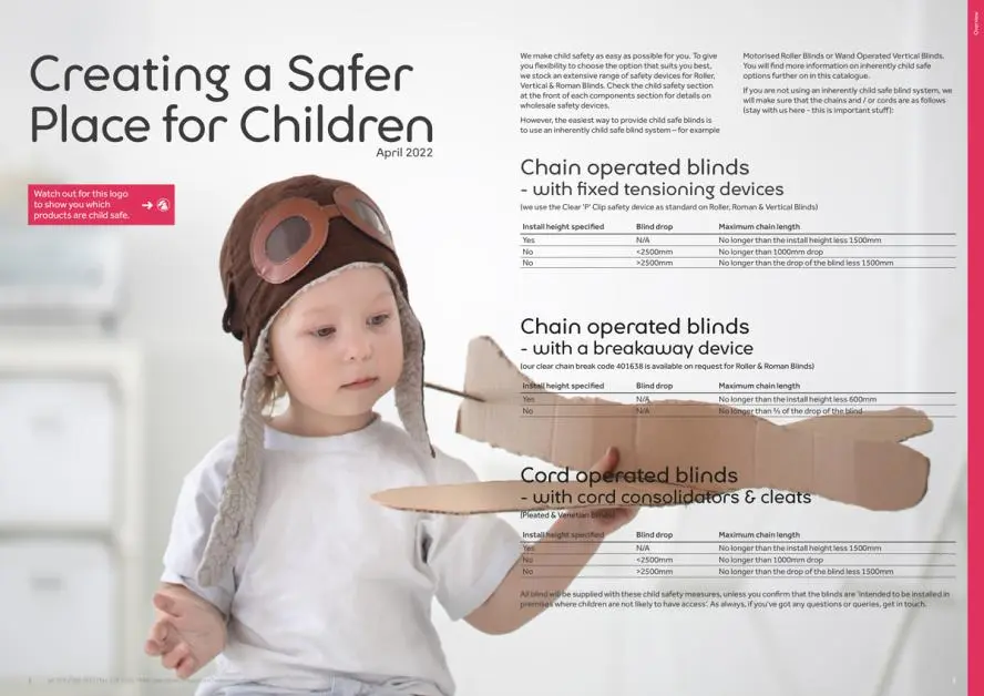 Blinds that are considered ‘safe by design’ are usually operated by alternative means eg. tensioned pleated blinds or wand operated verticals. By eliminating the looped cords and chains, these options and other such as motorised rollers are inherently child-safe, and we recommend making it your best practice to consider them as your first choice for any install, especially when they are to be fitted somewhere like a child’s bedroom.